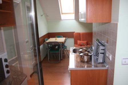 Apartman 2 poseduje jedan pomocni lezaj u trpezarijsko dnevnom boravku gde se nalazi i potpuno opremljena kuhinja. Kupatilo u sredini apartmana, vizuelno potpuno odvaja proctor u kome se nalazi veliki bracni lezaj sa velikim garderobnim delom i TV sa kablovskim signalom. Apartman je klimatizovan, poseduje parking mesto i veliku, prostranu, natkrivenu terasu, sa pogledom na lepo uredjeno dvoriste. Terasa je opremljena sa baštenskim stolicama i stolom pogodnim i za rucavanje.